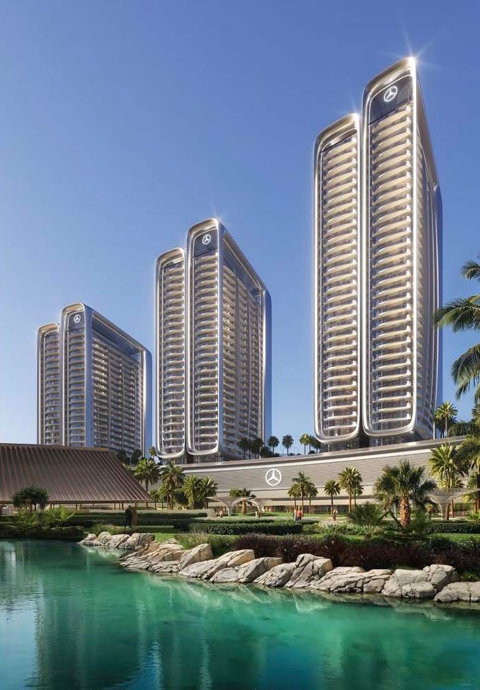 The development is composed of a collection of residential towers organised around a structured urban layout. Buildings are arranged with a focus on visual clarity, balanced proportions, and strong architectural presence. The design language takes inspiration from the engineering and performance heritage associated with the Mercedes Benz brand, translating movement and precision into built form.